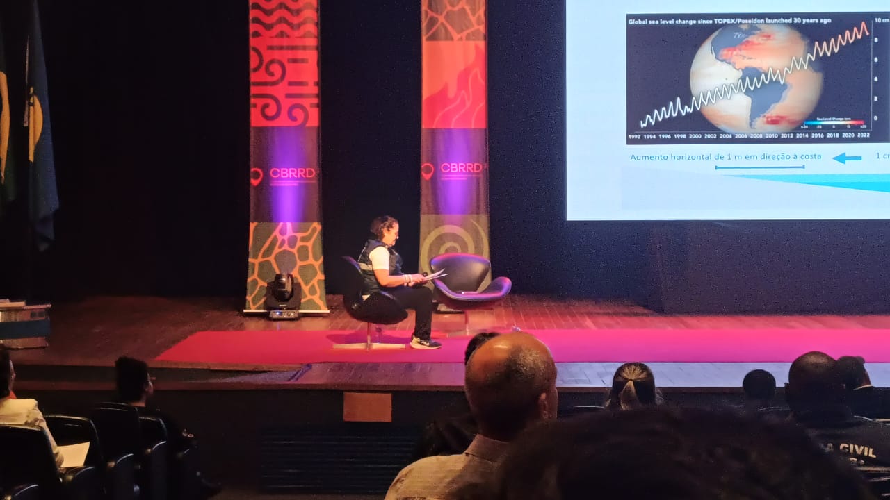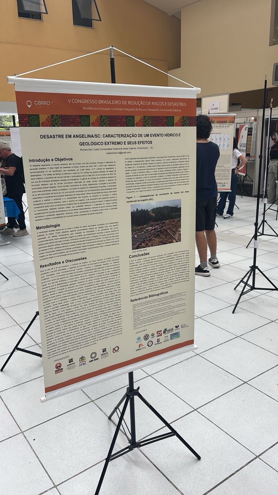 Rita, pós-doutoranda do laboratório, participou da organização do evento e foi moderadora da mesa - gestão integrada da zona costeira, enquanto Richard, graduando de geografia e monitor da disciplina de cartografia I, apresentou o cartaz - Desastre em Angelina/SC: caracterização de um evento hídrico e geológico extremo e seus efeitos.